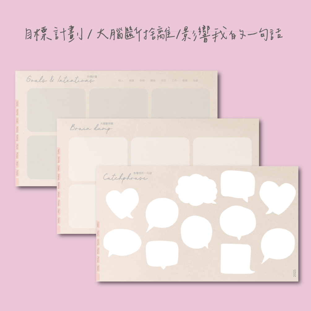 ★封面頁X1 目錄頁X1 年曆X1 年度計畫頁X2 目標計劃X1 夢想清單X2 閱讀日記X2 電影日記X2 影響我的一句話X1 大腦斷捨離X1 週規劃X1 空白頁X1 月封面X13 每月月曆X13 兩款週計劃X57 週反思X57 日計劃X13 小日記X13 筆記頁X6款